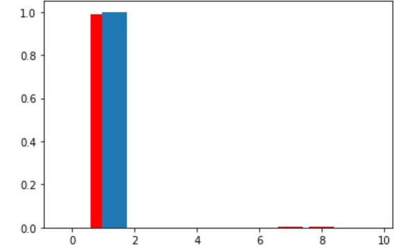 plt.bar(range(10), res[0], color='red') plt.bar(np.array(range(10)) + 0.35, test_labels[777]) plt.show()