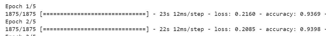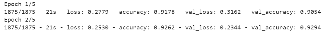 hist = model.fit(train_noisy_images, train_labels, validation_data=(test_noisy_images, test_labels), epochs=5, verbose=2)