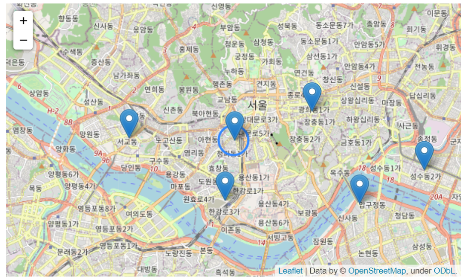 ์์ ์์๋ ์๋, ๊ฒฝ๋๋ฅผ ์ค์ ํ์ฌ ๋ง์ปค๋ฅผ ์ถ๊ฐํ๊ณ , ๋ง์ฐ์ค๋ฅผ ๋ง์ปค ์์ ์ฌ๋ฆฌ๋ฉด ๋ํผ์ ๋ช ์นญ์ ๋ณด์ฌ์ฃผ๋ ๊ฒ ๊น์ง ๋ฐฐ์ ๊ณ , ๊ฑฐ๊ธฐ์ ๋ํด์ ํด๋ฆญํ๋ฉด ์ต๋ ์์ฉ์ธ์์ด ๋์ค๋๋ก ํ๋ ์ง๋๋ฅผ ๋ง๋ค์ด ๋ณธ๋ค.