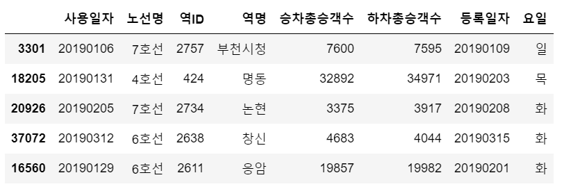 '์์ผ' ์ปฌ๋ผ์ ์ถ๊ฐํด ์ฃผ๊ณ , sample์ ์ด์ฉํ์ฌ ๋๋ค์ผ๋ก row๋ฅผ ๋ถ๋ฌ์์ ํ์ธํด ๋ณธ๋ค.