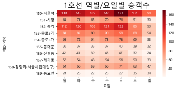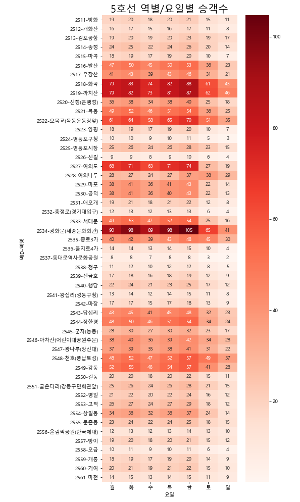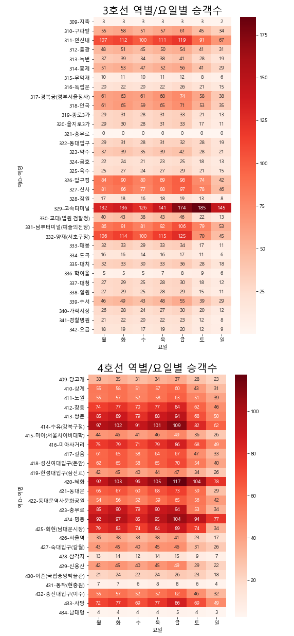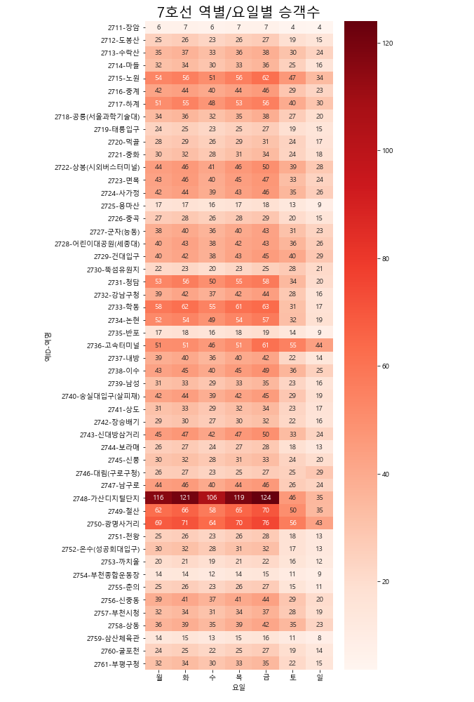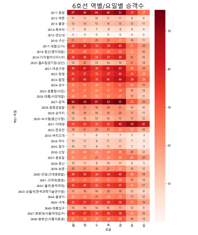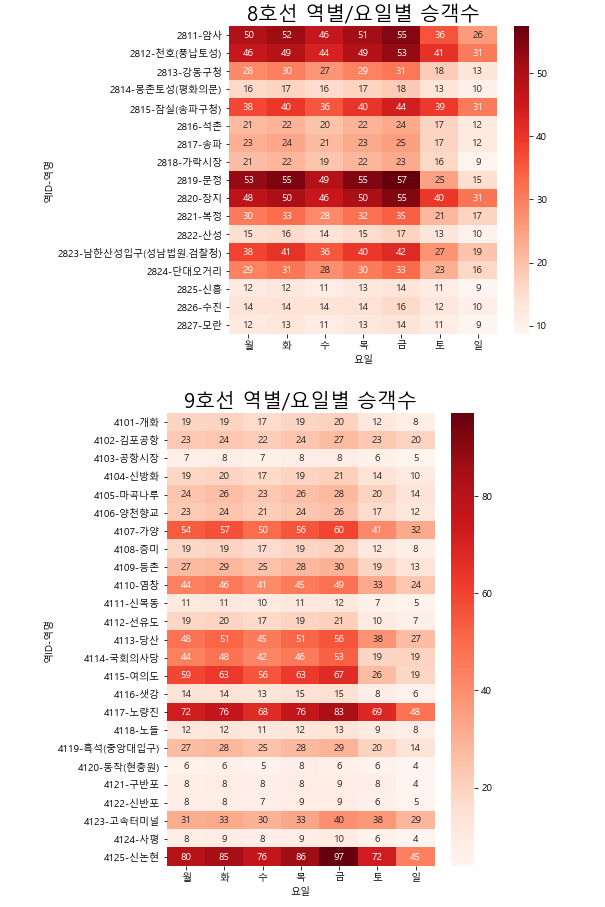 plt.title(f"{line} ์ญ๋ณ/์์ผ๋ณ ์น๊ฐ์", fontsize = 20) # for title