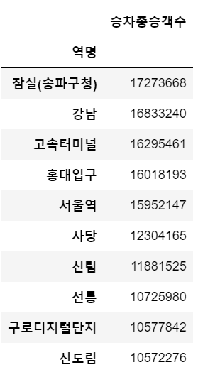data_station.head(10) # ์น์ฐจ์น๊ฐ์๊ฐ ๊ฐ์ฅ ๋ง์ ์ญ ์์ 10๊ฐ
