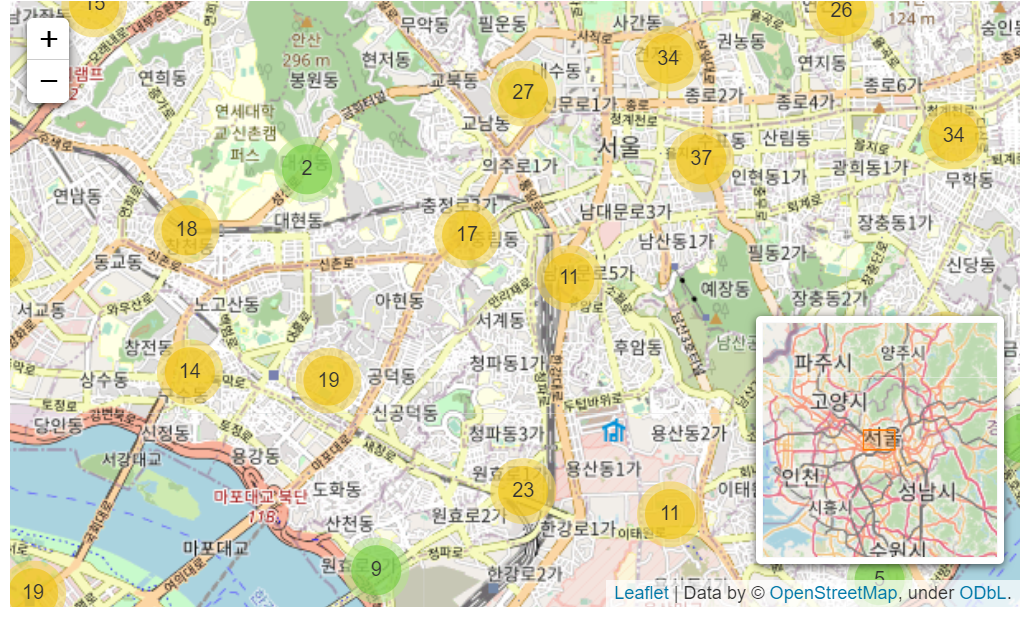 ํด๋ฌ์คํฐ์ ๋ฏธ๋๋งต์ ์ถ๊ฐํ ์ง๋์ด๋ค. ์ซ์๋ฅผ ํด๋ฆญํ๋ฉด ํด๋น ์ง์ญ์ผ๋ก ํ๋๋์ด ๋ ํธ๋ฆฌํ๊ณ ์ง๊ด์ ์ธ ์ง๋๋ฅผ ๋ณผ ์ ์๋ค.