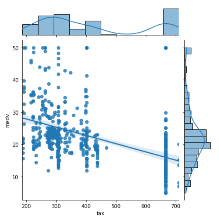 sns.jointplot(data=data, x='tax', y='medv', kind='reg')