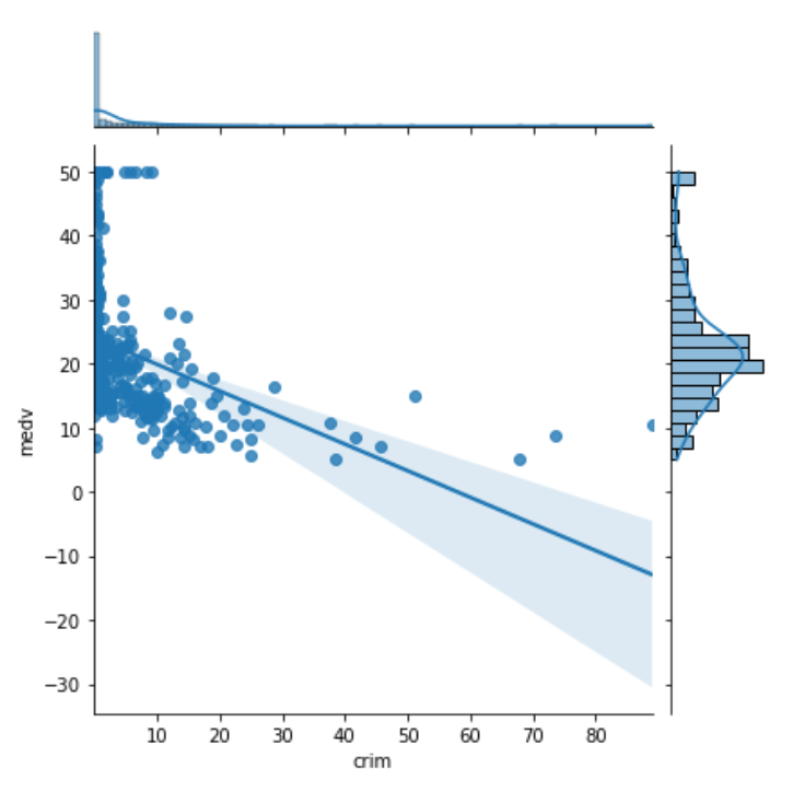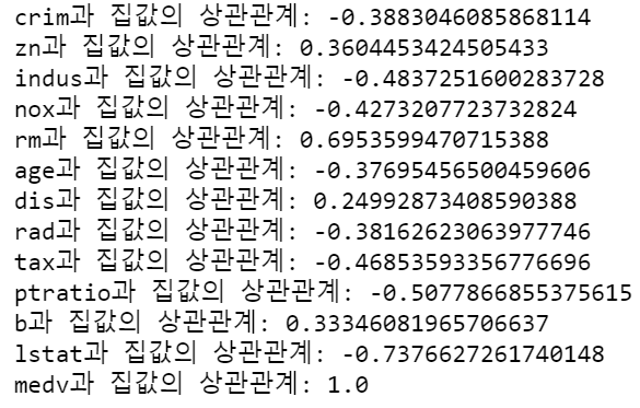 print(f"{column}๊ณผ ์ง๊ฐ์ ์๊ด๊ด๊ณ: {data[column].corr(data['medv'])}")