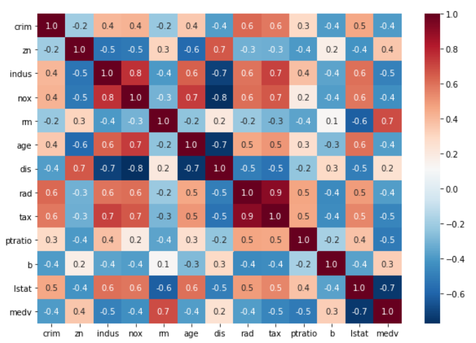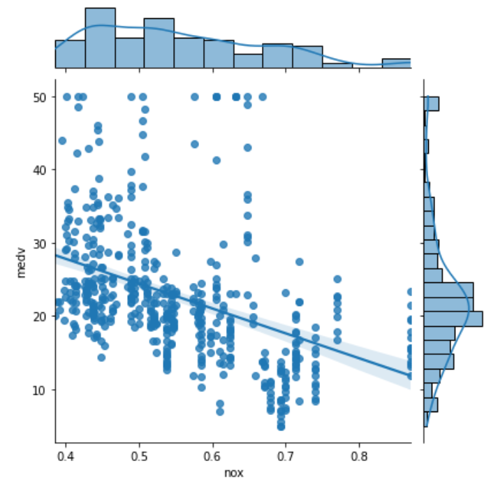 lstat์ rm ์ ์ง๊ฐ๊ณผ์ ์๊ด๊ณ์๊ฐ ๊ฐ์ฅ ๋์ ๊ฒ์ ์ ์ ์๋ค. ์ธ๊ตฌ ์ค ํ์ ๊ณ์ธต ๋น์จ(lstat)์๋ ์์ ์๊ด๊ด๊ณ, ๋ฐฉ์ ๊ฐ์(rm) ๊ณผ๋ ์์ ์๊ด๊ด๊ณ๋ฅผ ๋๋ค. ๋ฐ๋ฉด dis(์ง์ ์ผํฐ์ ๊ฑฐ๋ฆฌ), b(์ธ๊ตฌ ์ค ํ์ธ ๋น์จ) ์ ์ง๊ฐ์ ๋ฎ์ ์๊ด๊ด๊ณ๋ฅผ ๋ณด์ธ๋ค.
