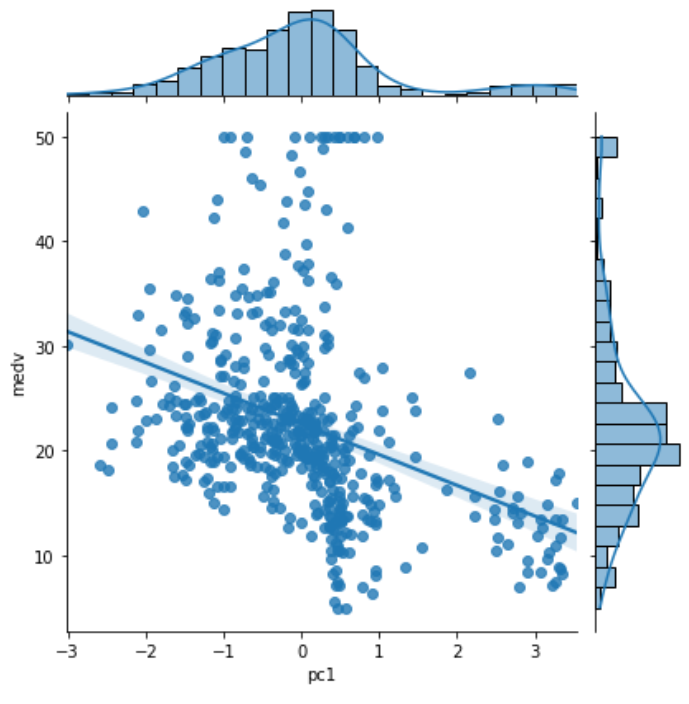 sns.jointplot(data=data, x='pc1', y='medv', kind='reg')