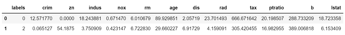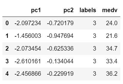 ๊ฐ๊ฐ์ ์์ธก๋ ๊ตฐ์ง ์ข ๋ฅ๋ฅผ labels ์ปฌ๋ผ์ ๋ฃ์ด์ค๋ค.