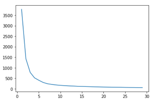 1๋ถํฐ 30๊น์ง ๊ตฐ์งํ๋ฅผ ํด๋ณด๊ณ , ๊ฐ์ฅ ์ ์ ํ ์์ง๋์ ๊ตฐ์ง๊ฐ์๋ฅผ ์ ํด์ฃผ๊ธฐ ์ํ์ฌ ๊ทธ๋ํ๋ฅผ ๊ทธ๋ ค๋ณธ๋ค.