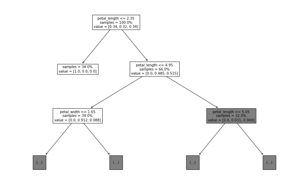 a=tree.plot_tree(dt,feature_names = ['sepal_length','sepal_width','petal_length','petal_width'],impurity=False, max_depth=2, fontsize=10, proportion=True)